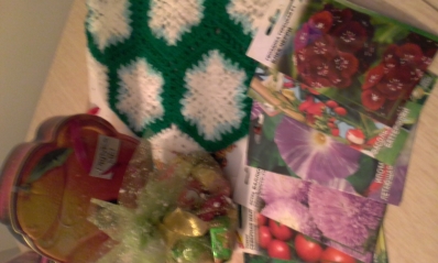 На 2-6 фото Милы. Венок очень красивый. Я сладкоежка и вкусные конфеты сегодня же и съела.) А в красивых и тёплых тапочках на меховых стельках будет тепло и уютно на даче. Манишка внуку в комплект к шапочке подаренной в ноябре.