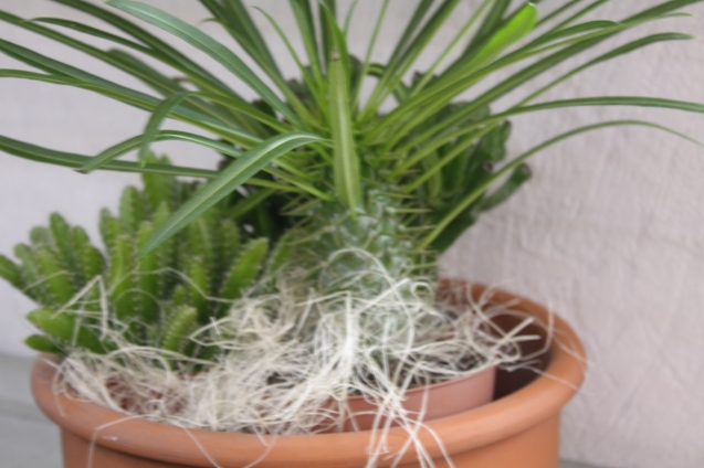 И снова суккуленты. Но на сей раз в декоративном горшке. Садик из суккулентов – хороший живой подарок кому угодно и по какому угодно поводу, так как они разнообразны и очень живучи.