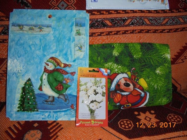 Милые форумчане, у меня приятный сюрприз, ко мне пришел Дед Мороз. Посылочку получила еще в среду, простите, что не сразу поделилась радостью( приехал сын в отпуск с Курил, на очень маленький срок- из-за учений отзывают с отпуска раньше, так что сейчас все внимание и время только ему). Спасибо большое Деду Морозу - Зобовой Елене Васильевне за подарочек, все понравилось очень. Эустому никогда не сажала, но попробую. Досочка- супер и полотенечко с символом года- собачкой красивенное. Фото прилагаю