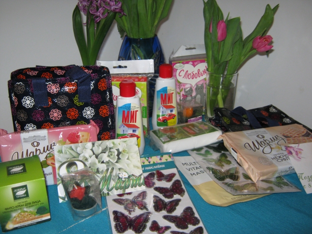 Так получилось, что посылку от Оксаны я получила вчера, Хотя на почту она поступила 7 марта. Это поздравление меня и Милы с 8 марта. В посылке много полезных вещей и вкусностей. Здесь и крем для лица, и гель "Миг" для рук, незаменимый для автомобилистов и дачников. И очень приятные декоративные штучки для дачи и дома. Одну фотографию поставлю боком, никак не хочет повернуться на 90 гр. два раза уже пробовала. Все это упаковано было в миленькие, маленькие сумочки.