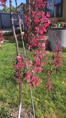 Да, плакучей формы. Посажена в прошлую весну, в этом году впервые увидела цветение, а запах… Отходить не хотелось от деревца! Плоды сейчас как горох крупный. Если на зиму плоды не снимать, то на морозе яблочки издают тихий звон когда колышет ветер и, птичкам корм.