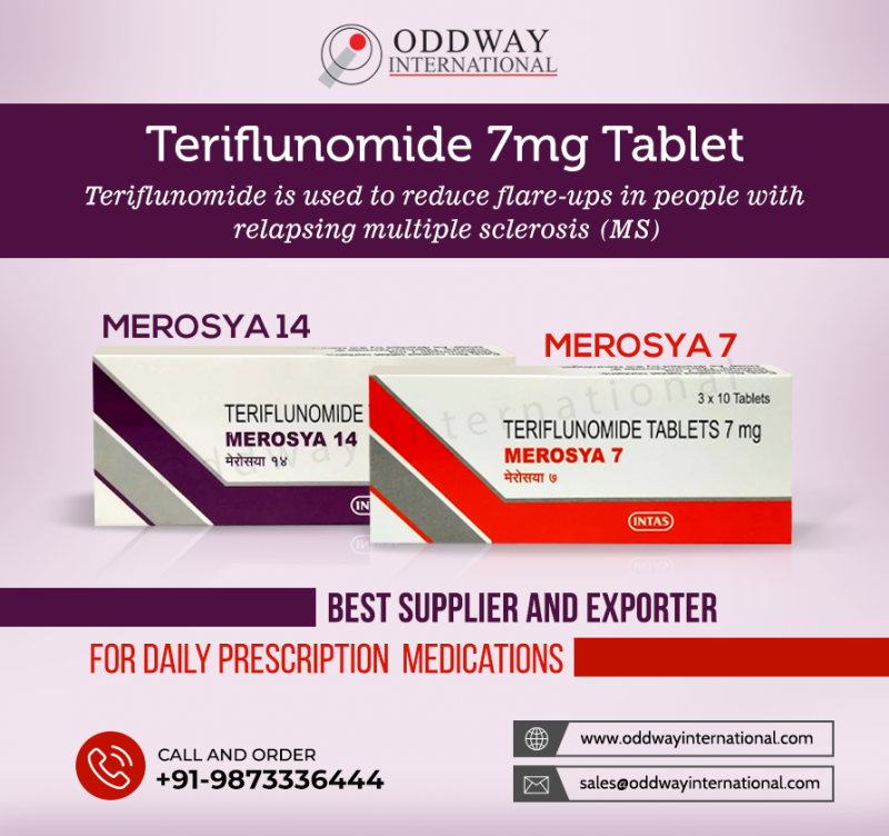 Teriflunomide is used to treat relapsing forms of multiple sclerosis in adults (including clinically isolated syndrome, relapsing-remitting disease, and active secondary progressive disease). If you requirement Teriflunomide Tablets you contact directly oddway international. Oddway International provide Teriflunomide Tablets at the best price. Oddway International is the pharmacy wholesaler and pharma Distributers Company in india. https://www.oddwayinternational.com/generic/teriflunomide-brands-in-india